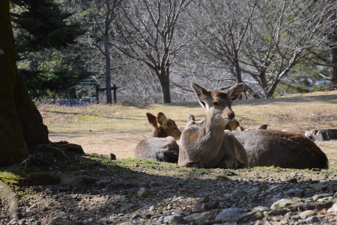 陽だまりには鹿の群れが憩い、所々の紅梅はたくさんの花を咲かせている。