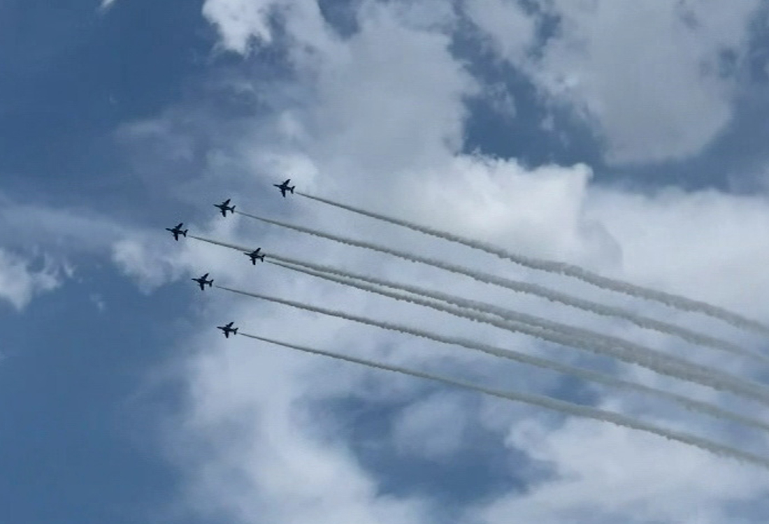 当初大阪ー関西万博の開催初日に併せて実施予定であったが、雨天のために延期されていた「ブルーインパルス」による飛行が、晴天にも恵まれて予定通り今日実施され、自宅3階のベランダから、その撮影に成功したので紹介する。