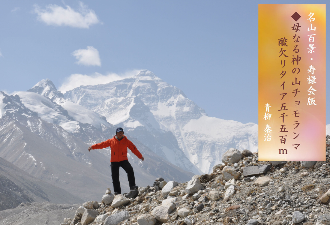 ホーム > 富嶽三十六景寿禄会版 > 名山百景 寿禄会版(三十七)、チョモランマ8,848メートル、酸欠リタイア青柳5500メートル 2024/12/24 ◆名山百景(三十七) チョモランマは、チベット語で「世界の母なる神」の意。「標高は8,848m。」山頂付近の平均気温は -30度、風速30m、体感温度は-60度にも及ぶ。酸素は地上の3分の1しかなく、酸素マスクをつけていても体力をはげしく消耗する。未体験ゾーンの踏破に挑んだが、5,500m地点で無念のリタイアとなった。 - 富嶽三十六景寿禄会版 青柳泰治