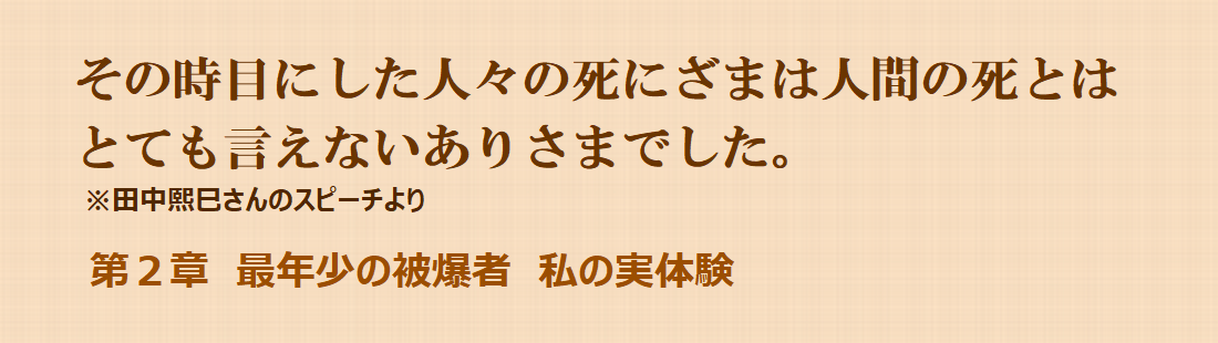 私は13歳の時、爆心地から3キロの自宅で被爆。爆撃機の爆音が聞こえるや否や、突然、真っ白な光とともに強烈な衝撃波を受け、気が付いた時は大きなガラス戸の下敷きになっていました。3日後、丘に登り、街を見下ろすと見渡す限り、焼き尽くされた廃墟で、東洋一を誇った浦上天主堂も崩壊。道筋は遺体だらけ、生き残っている人も救援もなく放置され、自分自身も茫然自失でした。(中略)