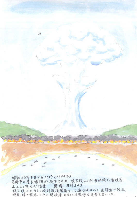 「原爆投下直後、島の防空壕に避難。いろいろな情報が入る中、誰かがたった一発の新型爆弾で長崎が全滅したと言う。幾ら何でもそんなバカな。確かめに行こうと言い出すも、誰も怖れて、防空壕を出ようとしない。結局、私と同級生二人で裏の長浜山に登り、遥か沖合の長崎を見降ろした。投下直後だったので、B29はまだ原子雲の周囲を旋回していた。燃え盛る長崎全貌を見渡せる場所はこの山だけ。この二人が生き証人となった」※叔父博の「思い出の記」より