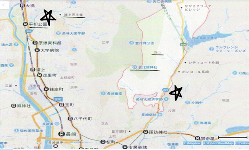 それだけの事情で、次の目標である三菱造船所を擁する長崎に切換え、澄み切った青空から悪魔「ファットマン」を投下した。市内松山町上空500mで爆弾炸裂。死者74,000名。一瞬の殺戮であった。中川町は爆心地から僅か3.7km。平地ならば焼け爛れる距離。だが爆心地と中川町の間にある「金毘羅山」が盾となってくれたお蔭で、母とお腹の児は生き延びた。私は白地部分「西山地区」の枠外下部「下西山」にあった川原別宅にて胎内被爆した。