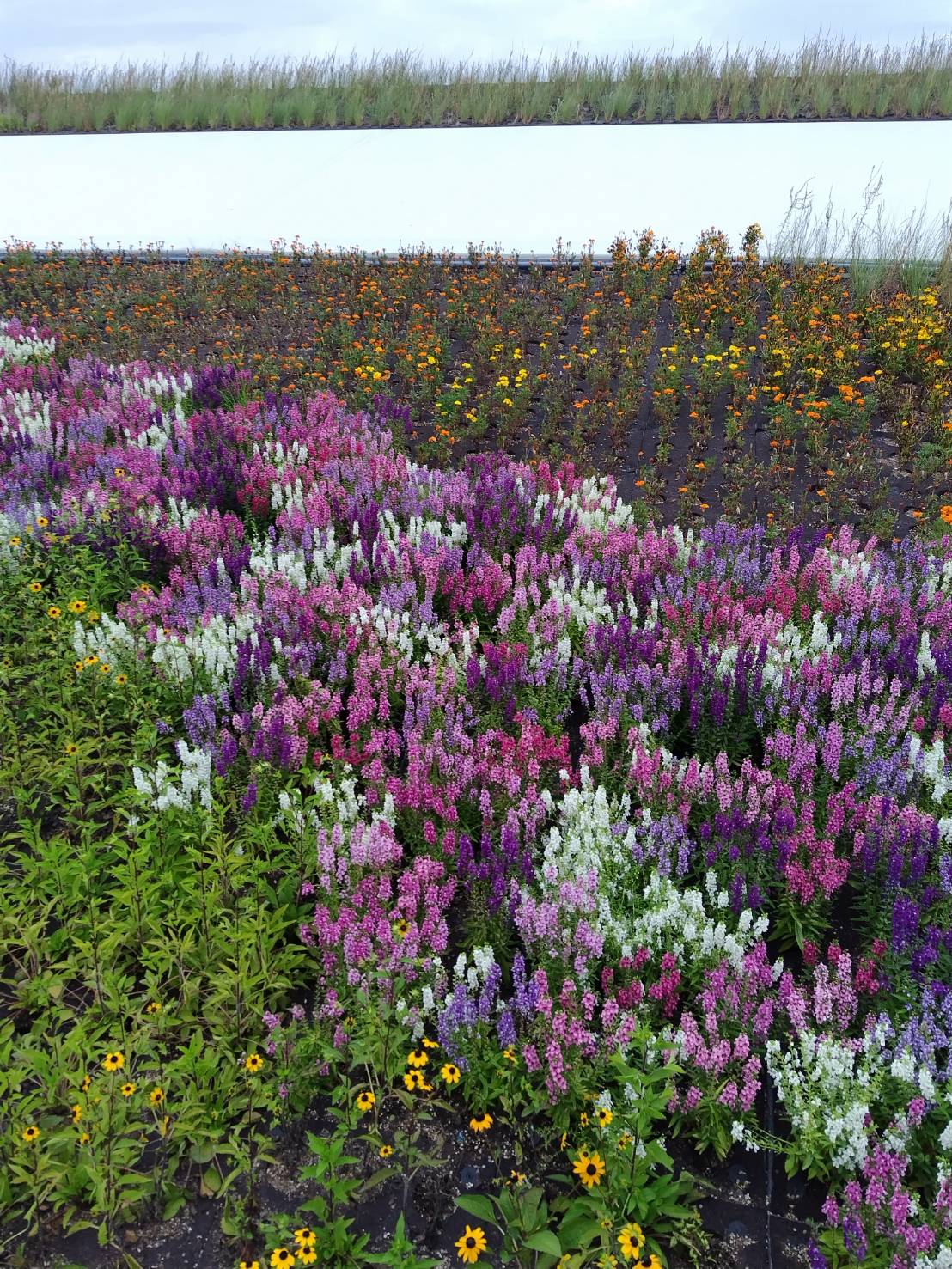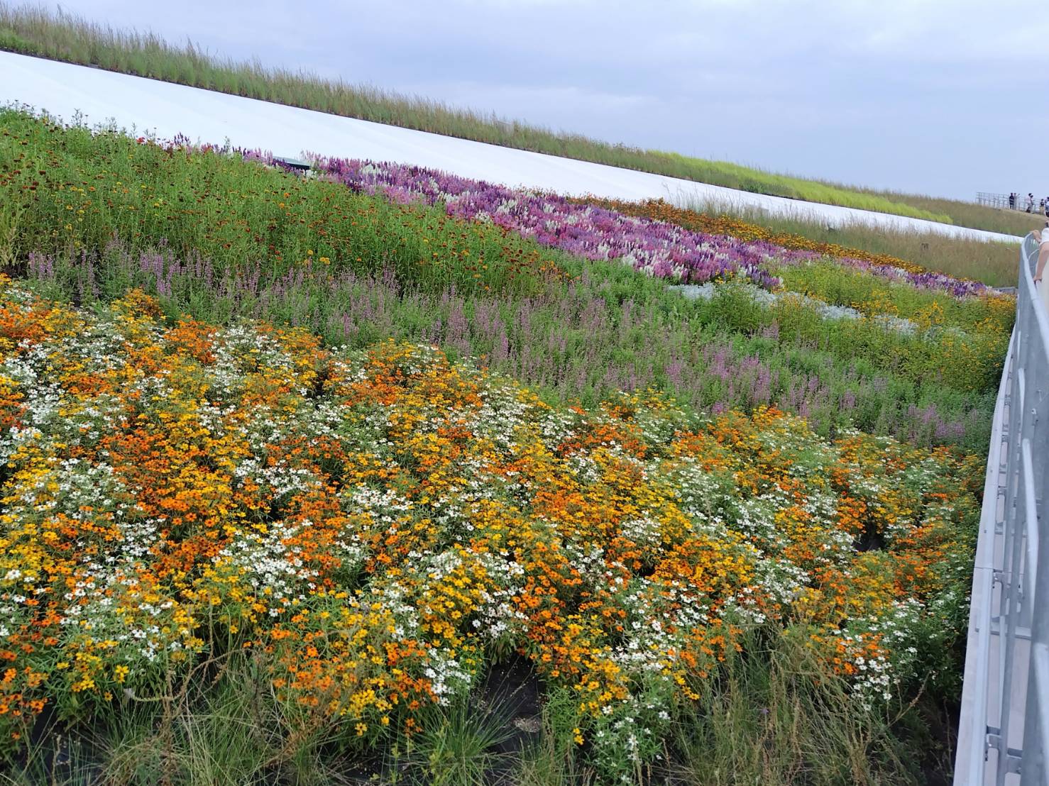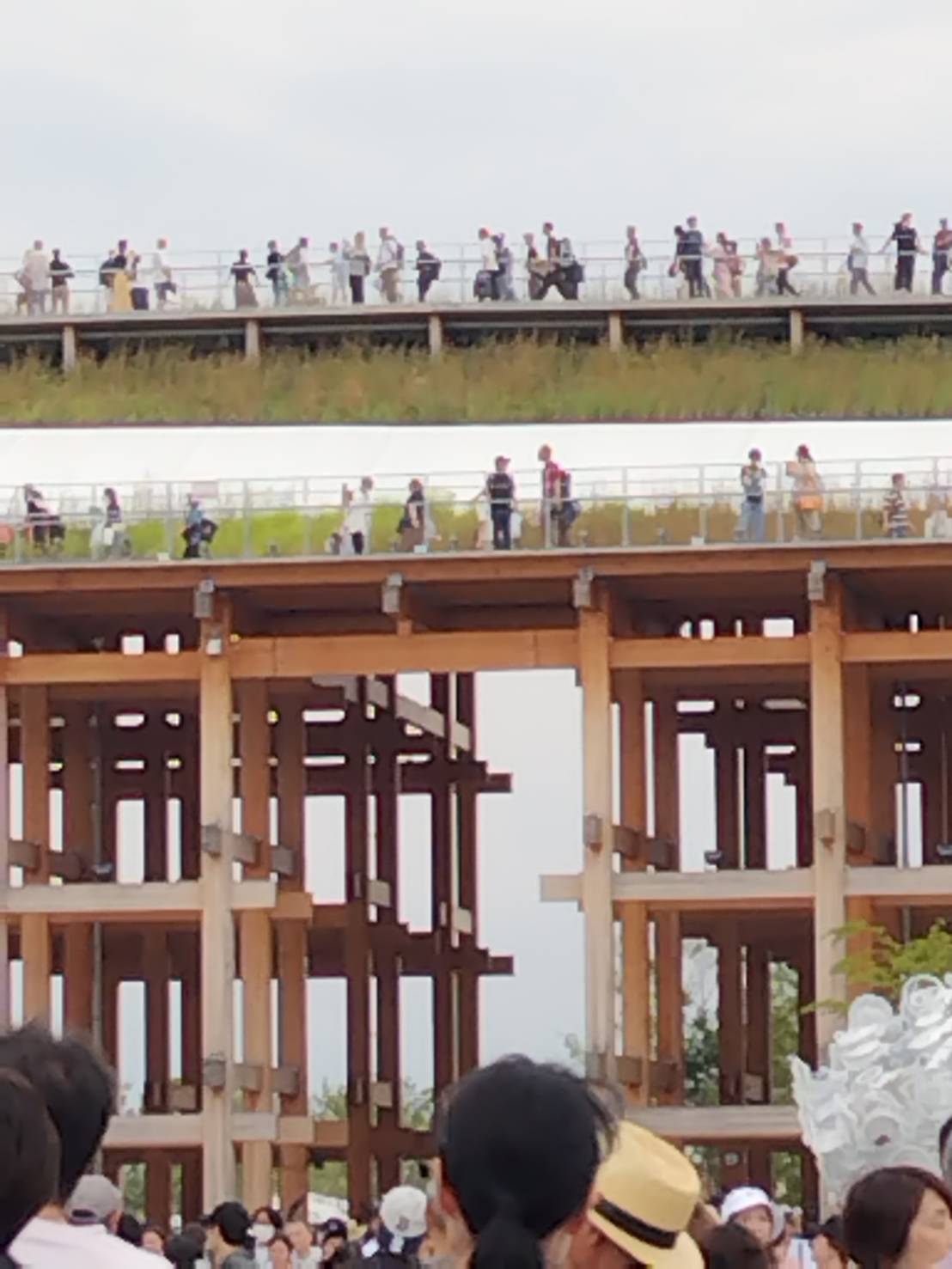 万博の目玉一周2kmの大屋根リングに上って、四分の一周くらい歩く。土手には花々が咲き乱れていた。上から眺めるリングの巨大さには驚くばかり。