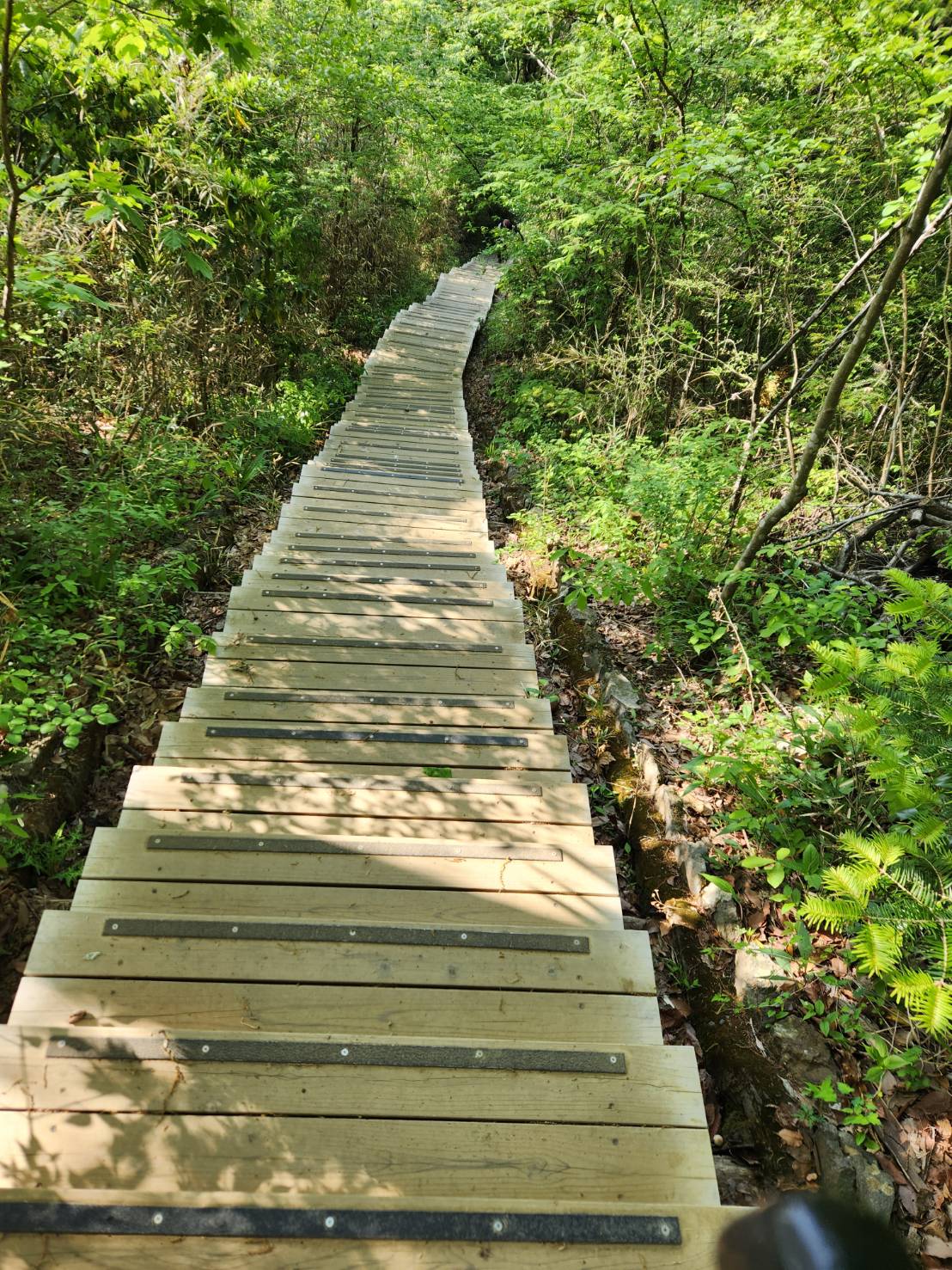 後半は6号路と別れ、尾根路稲荷山コースに合流して、山頂へ向かいます。登山道改修工事でリニューアルされた木の階段が続きます。歩きやすくラクです。