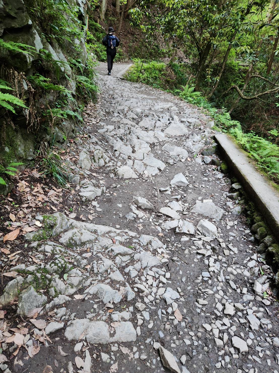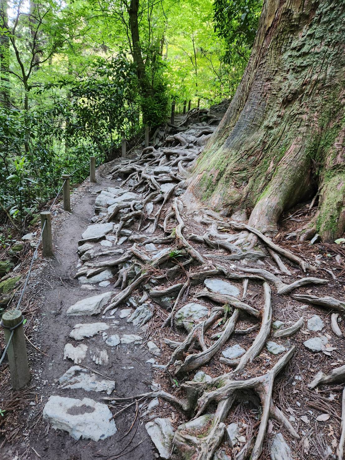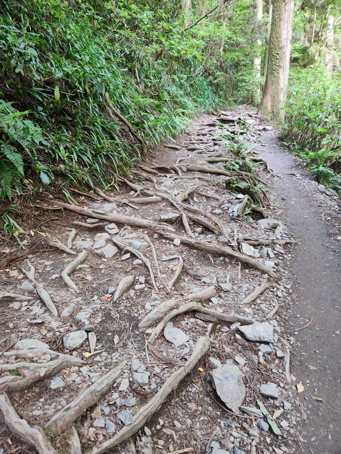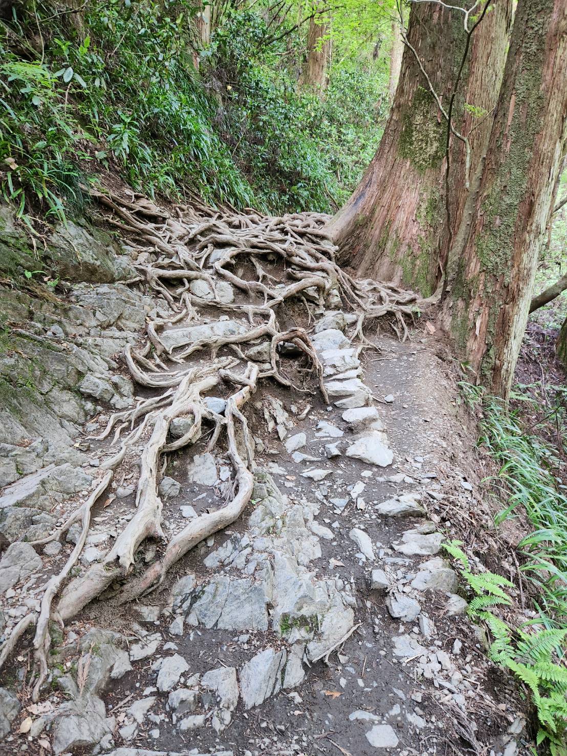 6号路の入り口からしばらくは、石ころ、岩、木の根が地を這うように剝きだしになっている路が続きます。足を充分に上げずに歩いていると引っ掛かり、転倒の危険があります。