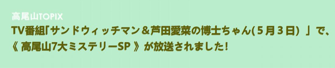 番組では歴史的な視点から、ミステリーの形で高尾山の魅力を掘り下げて紹介していました。薬王院の特異な存在、山が修験道の聖地であること、天狗信仰のことなど。古くから高尾山が、霊山として信仰の対象であったことを初めて知りました。