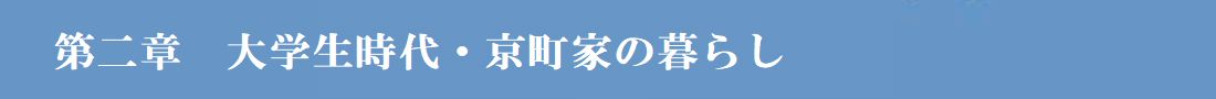 ●同志社大学入学 ●三宅八幡で青春を始める ●京町家の暮らし ●障子をあければ比叡山 ●銭湯は叡電に乗って ●同志社子女ヒエラルキー ●アイビールックの神様・石津謙介 ●弟と「メンズクラブ」 ●ダンパ・合ハイって何だ ●神と共に生きる乙女たち ●ESSのこと ●合宿はお寺で ●法廷を真似たディベイト ●八坂神社前のフランス式デモ ●鞍馬の火祭 ●ベ平連と小田実、「何でも見てやろう」 ●あの頃流行った小説 ●反戦ソングとPPM ●弟(ミステリー、ジャズ、就職) ●あのころ東京は宝島だった! ●SEIBU堤家の兄弟 ●電話と十円玉 ●三善英史の「雨」 ●八坂神社の枝垂れ桜 ●京大北門前「進々堂」 ●名曲喫茶でバイト ●煙草王の別邸「長楽館」 ●叡電と嵐電 ●もと遊郭の下宿とはつゆ知らず ●自転車で飲酒二人乗り ●金沢・能登卒業旅行 ●就活