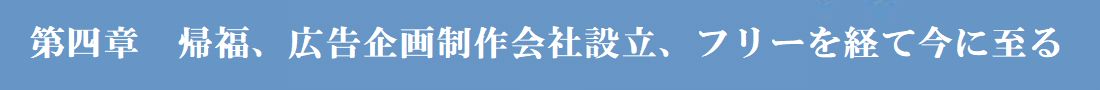 ●伝説の「花ジャム」でバイト ●親不孝通り盛衰記 ●ハロウィーンの翌朝にはいろんなものが落ちていた ●ヤンキー少年がヤクザの事務所で見たもの ●ヤンキー少年の事故死 ●近鉄バッファローズ西本監督 ●西鉄ライオンズ身売り ●ダイエーが福岡にやってくる ●広告企画制作会社「文化や倶楽部」設立 ●コピーライターという仕事 ●フリーに転身 ●八重山薬草園と石垣島 ●沖縄に心寄せる人々 ●宮沢和史の「島唄」 ●地方創世の仕事 ●火花を散らす壱岐VS対馬 ●プランニング秀巧社のこと ●プランニング秀巧社の終焉 ●不思議な時計 ●芸広舎のこと ●高倉和夫ディレクターの名言 ●クライアントはワガママだ ●友人に貸したクレジットカード ●弟の死、最後の会話 ●寿禄会ホームページのこと ●ありがとう藤本茂さん ●多くの人の支えがあって ●ああ楽しい人生だった